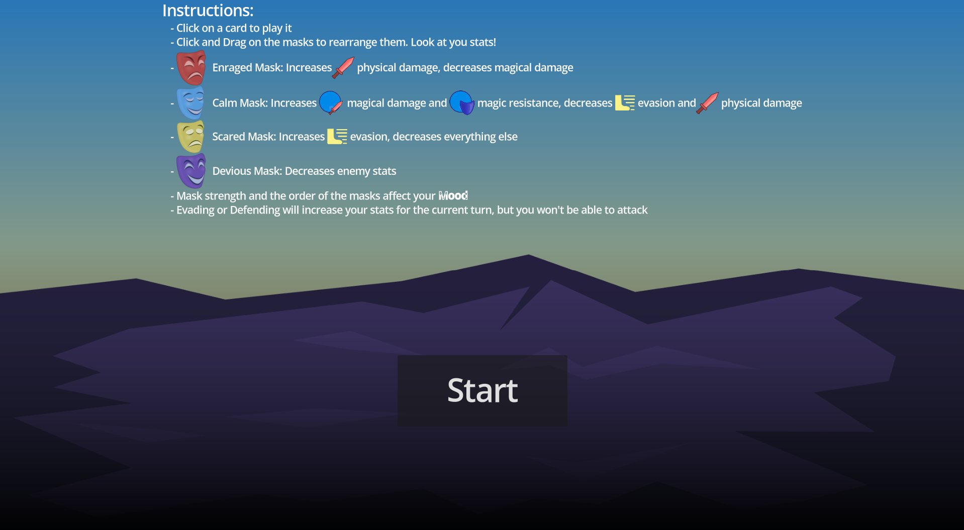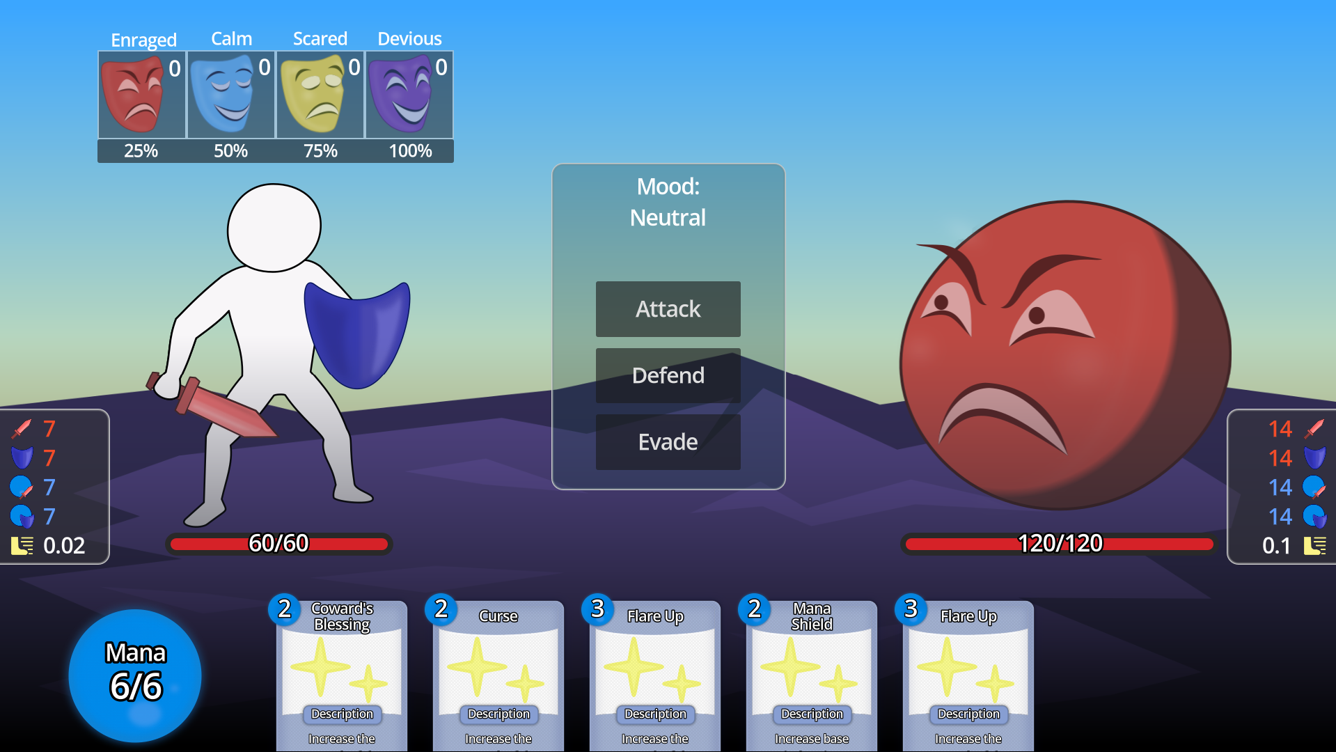 You are a big-headed, faceless warrior bound to a mask with multiple layers. Each layer embodies a mood - Rage, Calm, Fear, and Deviousness - and shapes how you fight. Also, you have to defeat an angry giant round red thing.